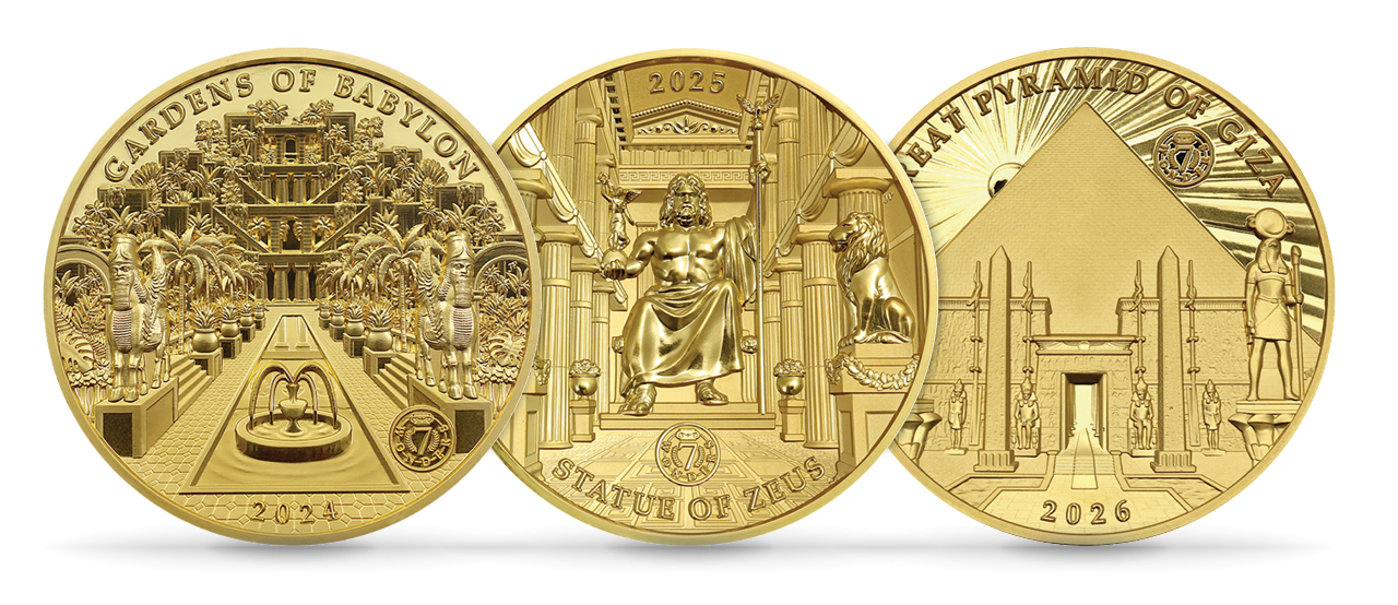 Každá mince z kolekce připomíná jeden z nejznámějších architektonických skvostů starověku. Po Zahradách Semiramidiných a Soše Dia v Olympii přichází třetí emise – Pyramidy v Gíze, symbol trvalé síly, přesnosti a lidské tvořivosti.