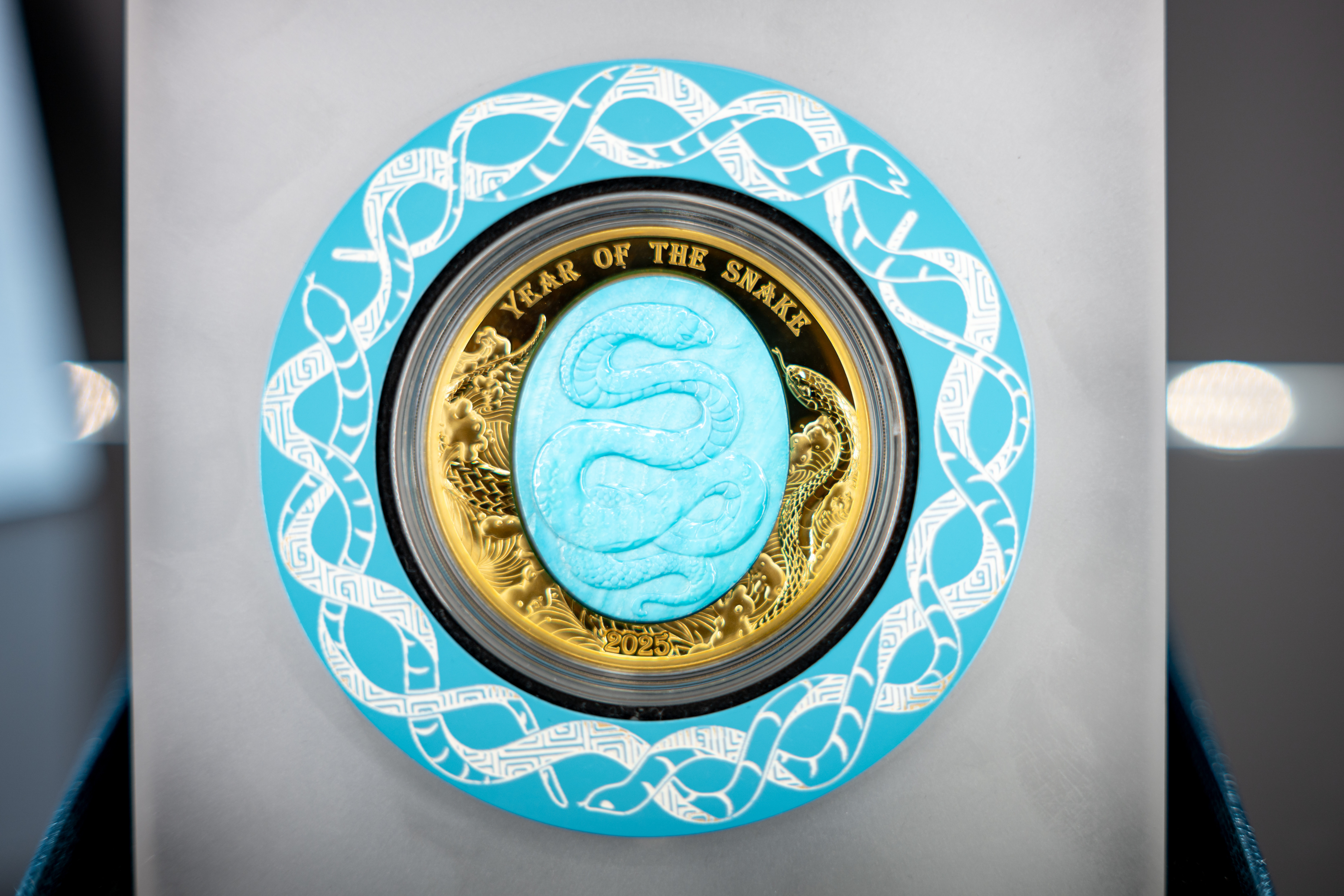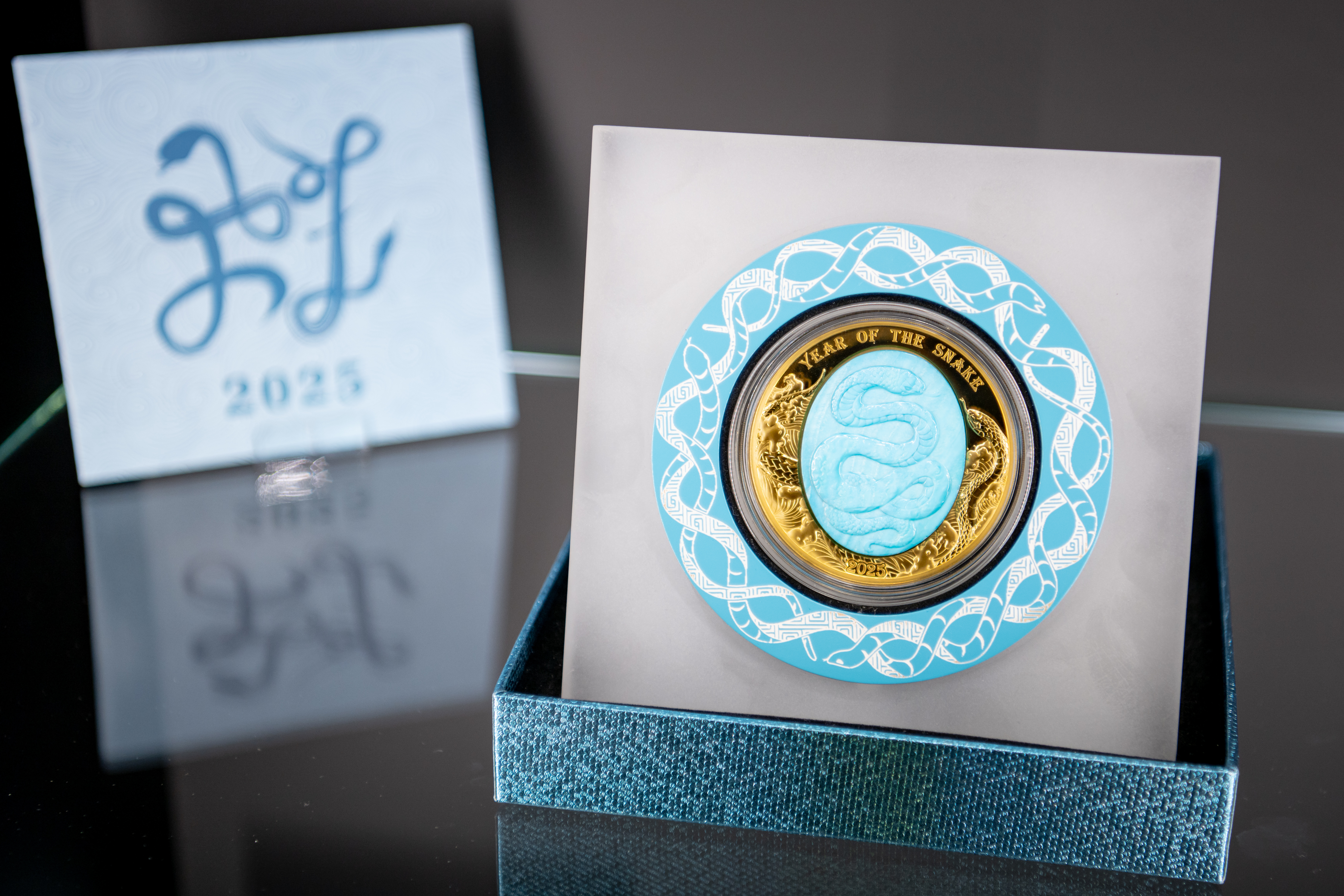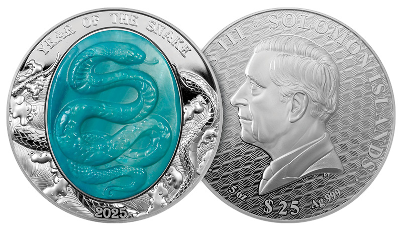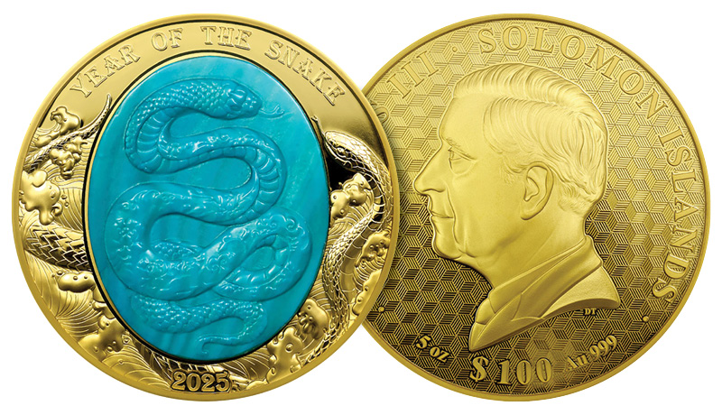 Technologicky unikátní minci vydává stát Šalamounovy ostrovy o váze 5 Oz (155,5 g) z nejčistšího 99,9% zlata. Perleťové jádro v odstínu nebeské modři, vložené do rubové strany mince, zobrazuje mytologického hada vznášejícího se na obloze. Oblaka a vítr, tedy prvky nebe, jsou zachyceny na těle draka, který je zpodobněn ve stylu tradičního čínského umění. Motiv je doplněn o nápisy „YEAR OF THE SNAKE“ a „2025“. Líc zobrazuje portrét krále Karla III. od Dana Thorna s iniciály autora „DT“ a nápisy „CHARLES III“, „SOLOMON ISLANDS“, nominální hodnotou „100 DOLLARS“ a údaji o váze a ryzosti kovu.